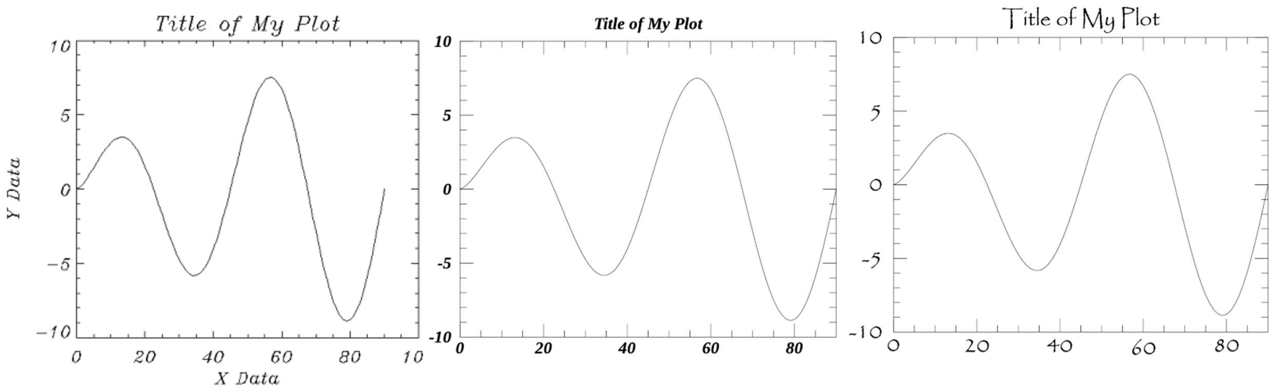 - Hershey 벡터 폰트 : IDL의 초창기부터 사용해온 폰트입니다. 도면(설계도)을 출력하는 데 강점이 있는 Plotter 프린터에서 최적의 성능을 내도록 고안된 폰트입니다. Direct Graphics의 기본 폰트입니다.